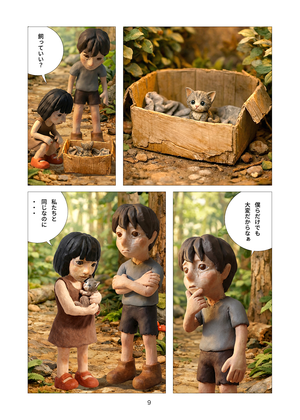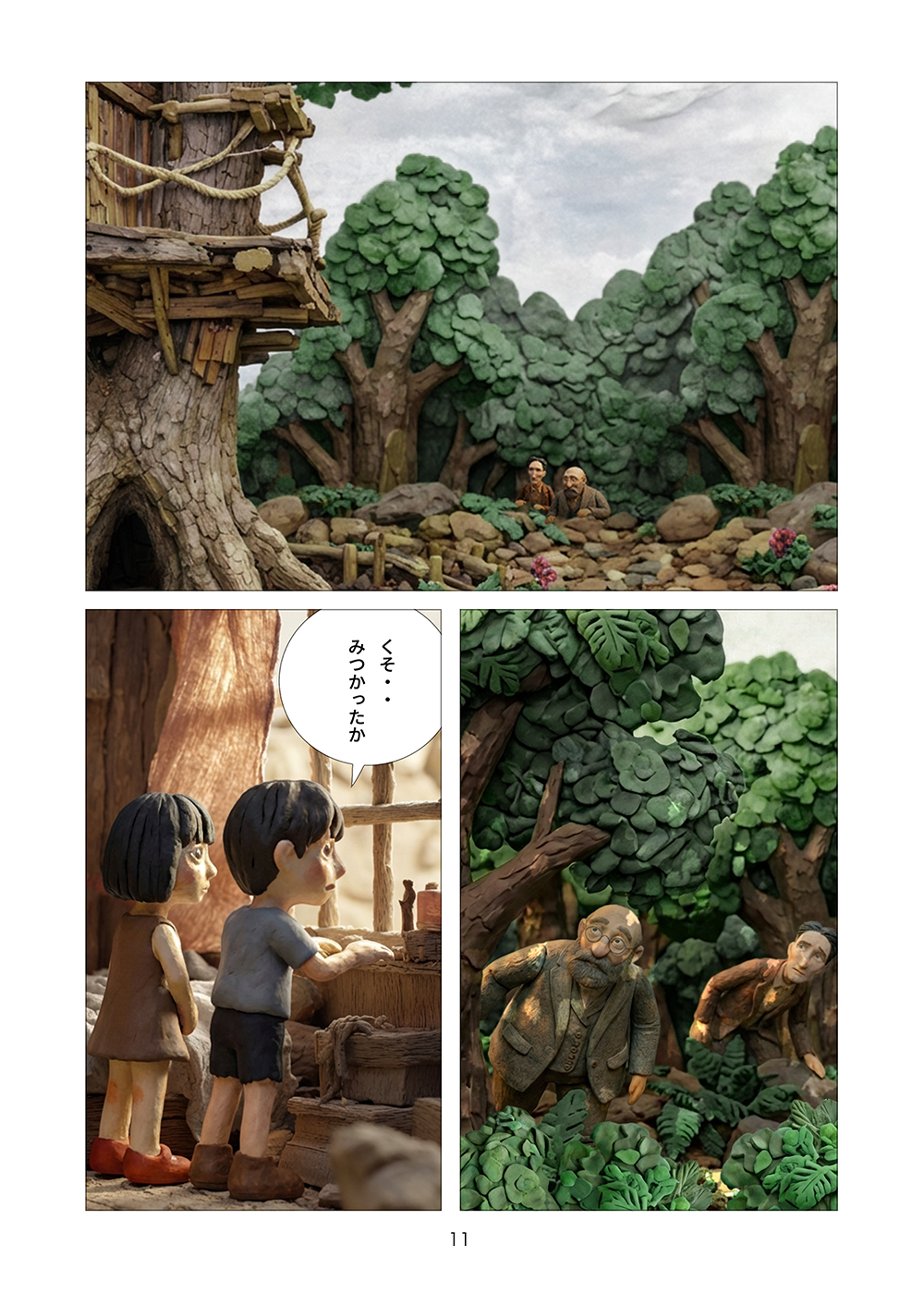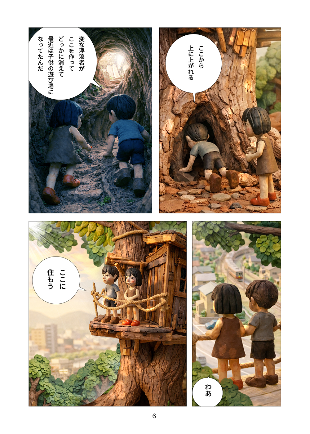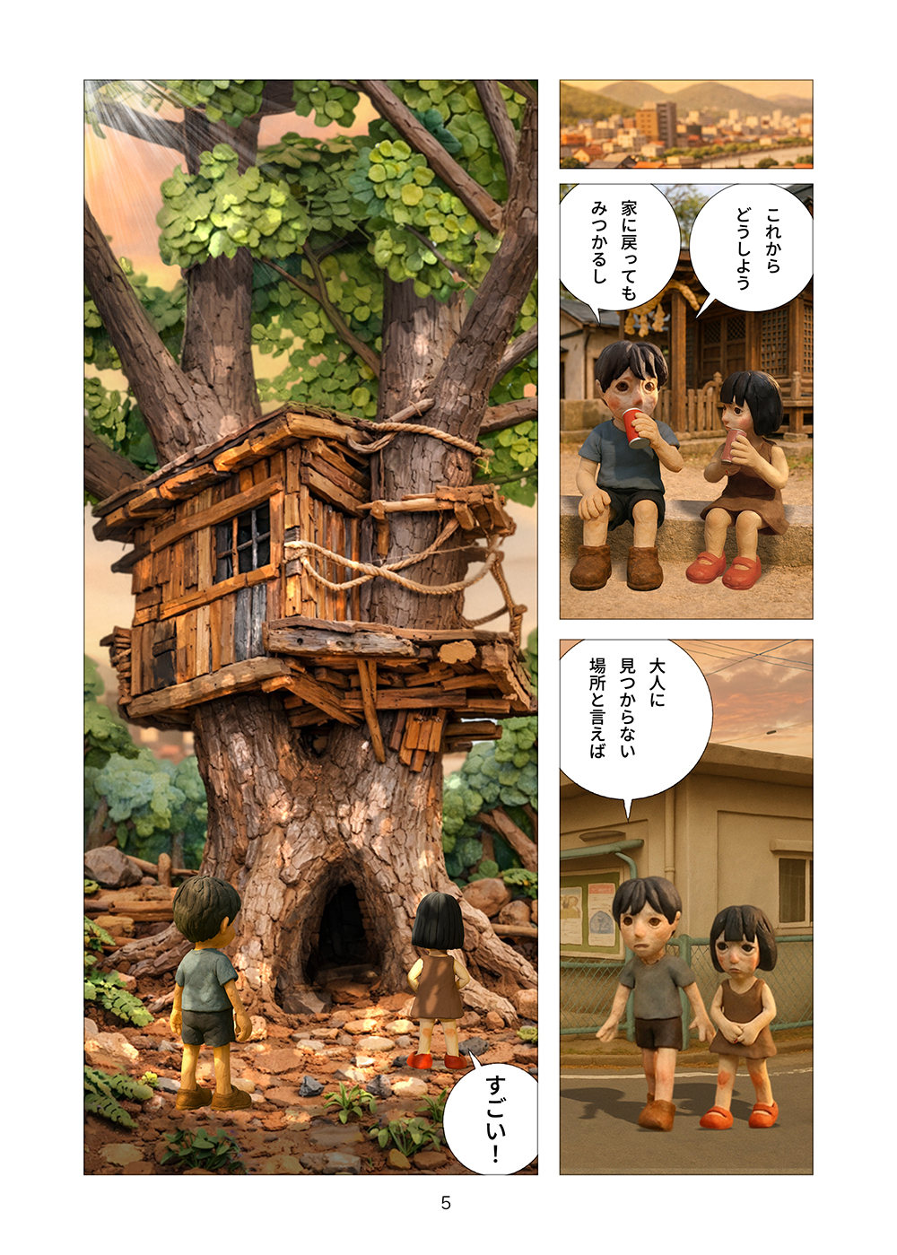 児童相談所から逃げ出した孤児の兄妹はツリーハウスを見つける。フルカラークレイ漫画。