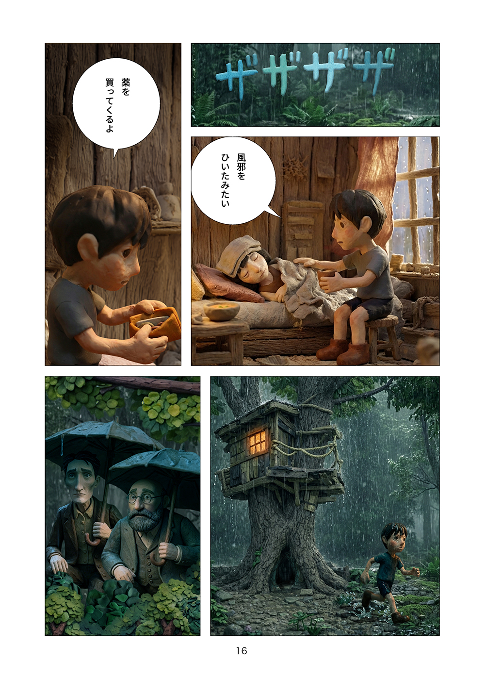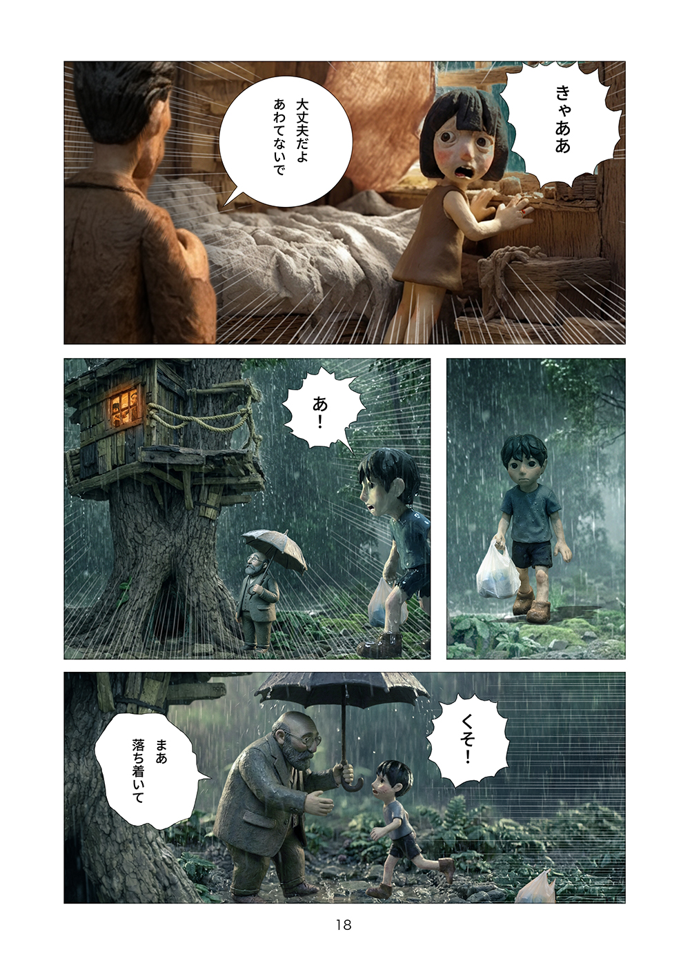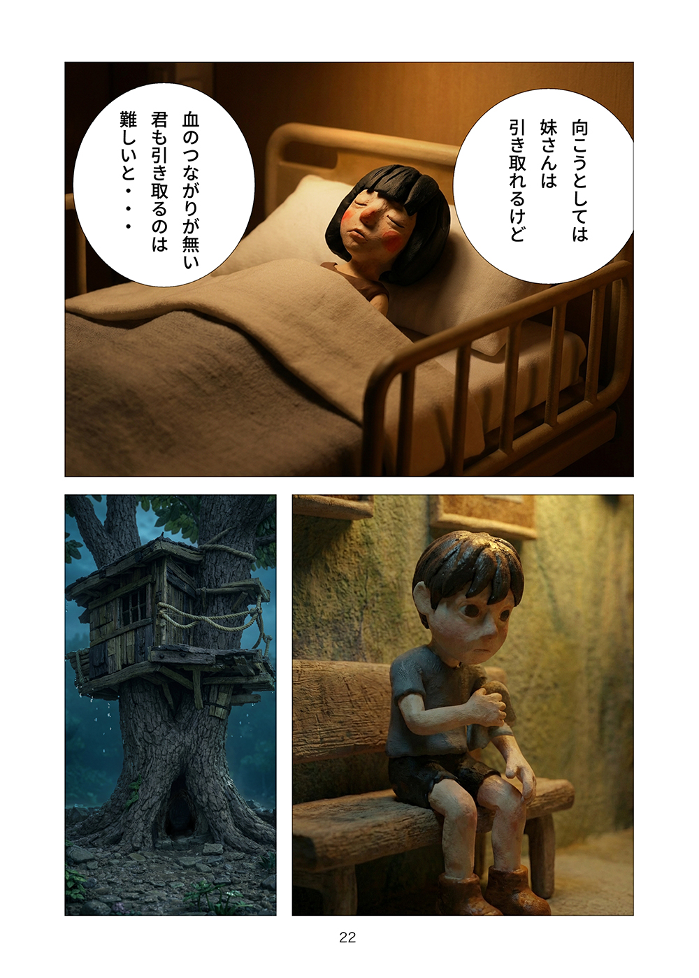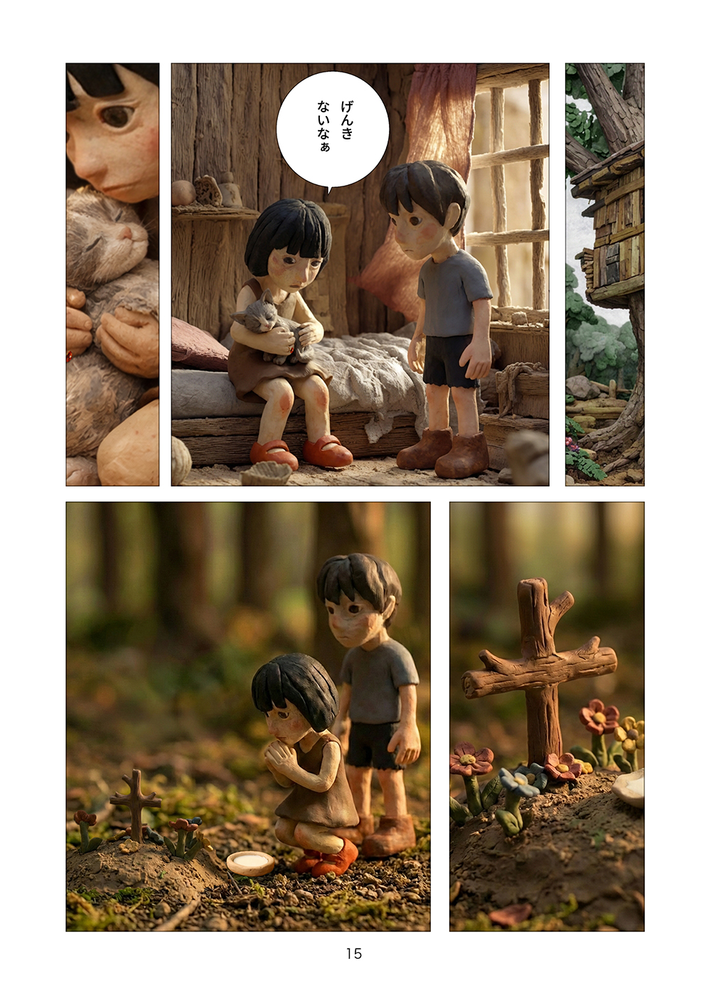 児童相談所から逃げ出した孤児の兄妹はツリーハウスを見つける。フルカラークレイ漫画。